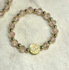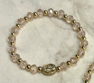 Bless this little one with a touch of sparkle! This delicate handmade bracelet features pale pink crystal beads paired with shimmering gold accents, all strung together by a talented local artist. A precious gold medal dangles from the wrist, making it the perfect keepsake for baptisms, baby showers, or a cherished gift celebrating new beginnings. Gentle, gorgeous, and full of meaning—your tiny treasure will love wearing this spiritual accessory.