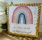 Beautifully handcrafted block art featuring the phrase "For This Child We Have Prayed". Adorned with textured gold trim and gold glitter.