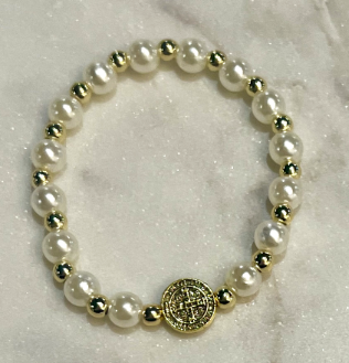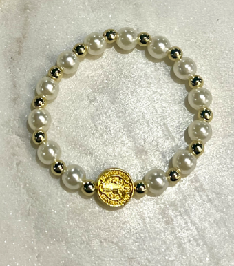 Celebrate your little one's arrival with this charming handmade beaded bracelet, crafted by a local artist with love. Featuring lustrous pearl and gold beads paired with a delicate gold medal charm, each bracelet is a unique keepsake. Available in small and large sizes to fit perfectly from newborn through toddler years. A thoughtful gift that's as special as baby itself—wear it, treasure it, pass it on!