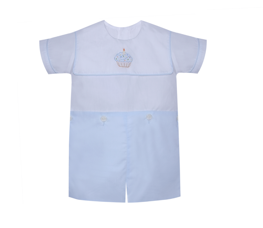 Features "bib" collar with embroidered cupcake, button on shorts, button closure at back.