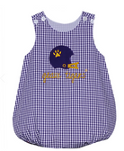 Your little fan will look precious in this hand embroidered with helmet applique' boy bubble.