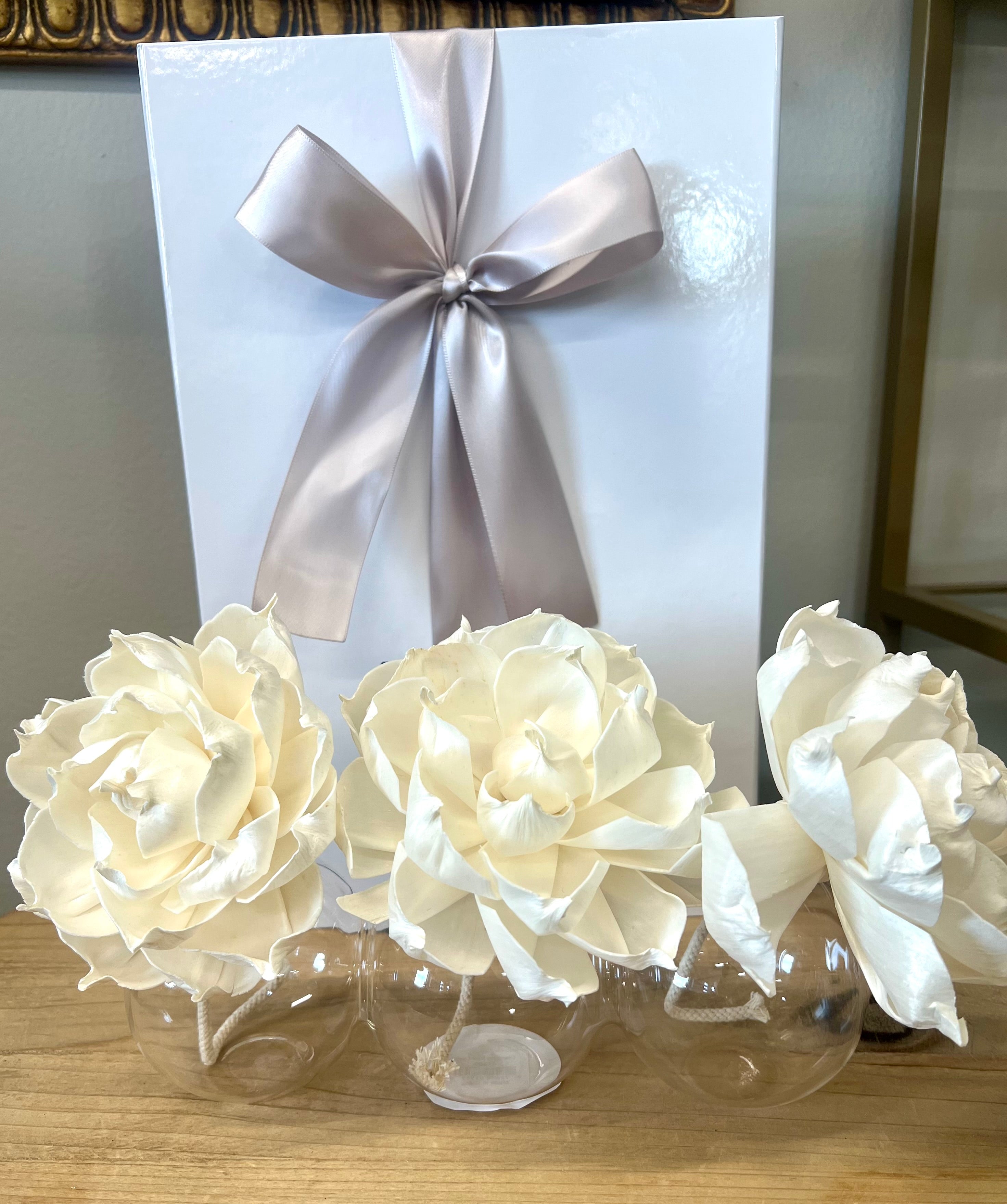 Beautiful glass bubble diffuser with flower diffusers. Can be refilled or used as a vase once empty!