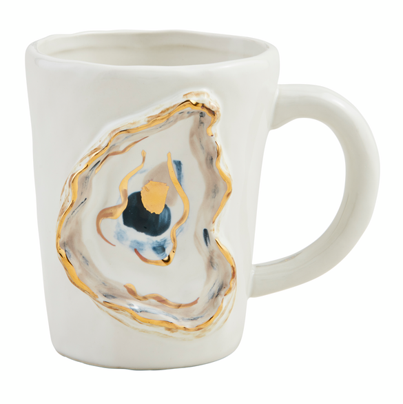 Oyster Shell Mug. This exquisite stoneware mug features a beautifully hand-painted layered oyster shell design, adding a touch of coastal elegance to your drinkware collection. With a generous 14 oz capacity, it's perfect for enjoying your favorite hot or cold beverages. Crafted from durable stoneware, this mug combines functionality with artistic flair, making it a delightful addition to any kitchen or dining setting.