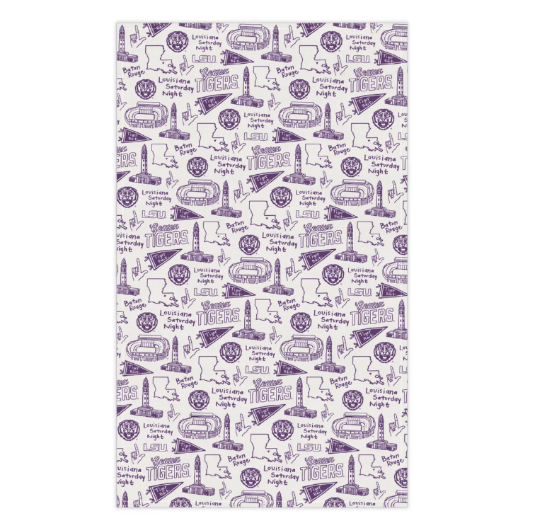 Show your school spirit in style with this officially licensed Louisiana State University collegiate printed kitchen towel! Featuring iconic LSU graphics like the Geaux Tigers' logo, Tiger mascot, and memorable campus landmarks. Perfect for alumni, students, or devoted fans. Made from soft, absorbent cotton, it’s as functional as it is fashionable—ideal for drying dishes, wiping counters, or adding a pop of pride to your kitchen décor.