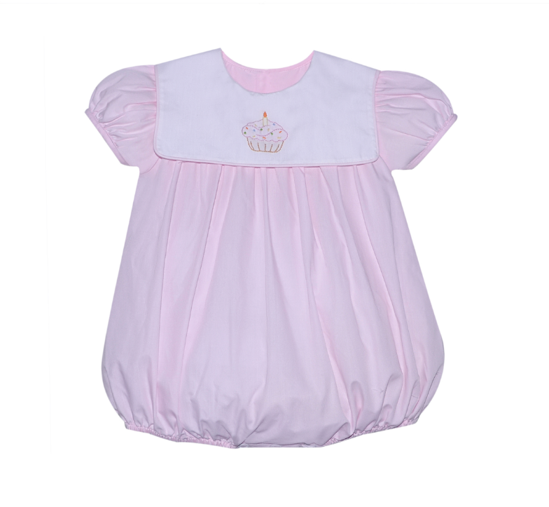 Features a white "bib" collar with embroidered cupcake, snap closure bottom, button closure back.