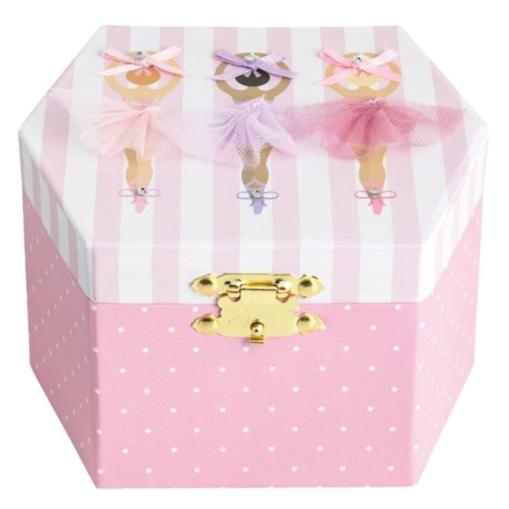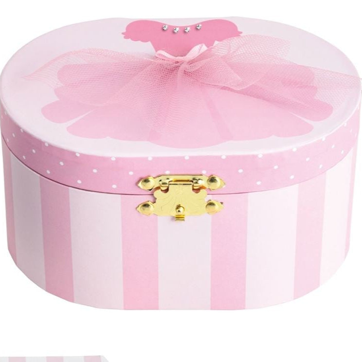 Delight in the charm of this paper-wrapped wind-up musical jewelry box, adorned with a delicate mesh tutu and sparkling gem details. Perfect for little dancers, it features a spinning ballerina and plays a sweet melody, making jewelry storage magical. With a handy ring holder inside, it’s a playful treasure for ages 3 and up.