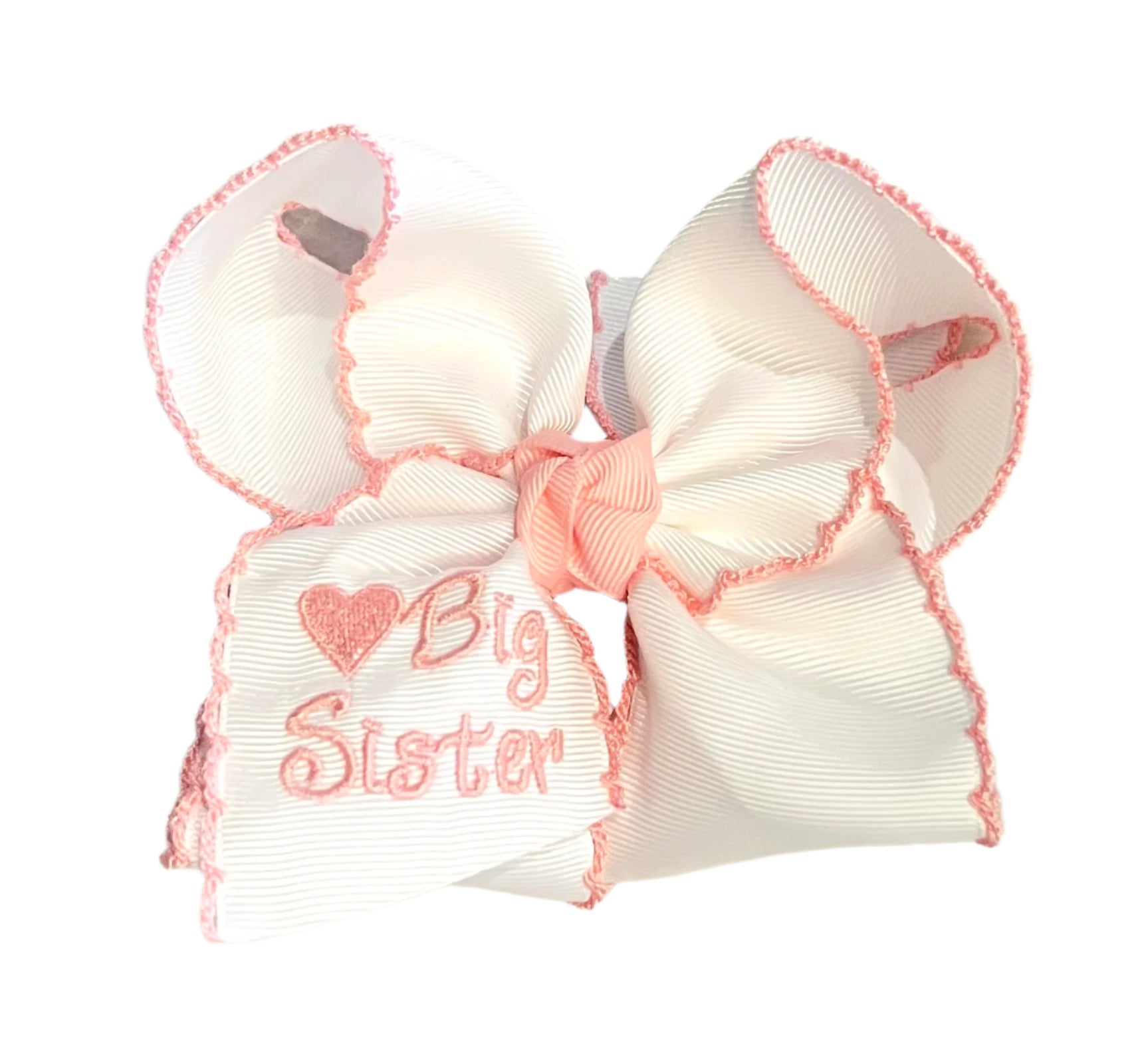 Adorable white bow with the sweetest pink crocheted edge.  Adorned with a embroidered heart and the words "Big Sister".