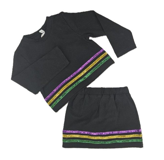 Let your little one steal the show in this adorable two-piece parade set! The long-sleeve top and skirt combo features a sleek black base with eye-catching purple, yellow, and green sparkly stripes that'll have everyone cheering. Built-in shorts under the skirt mean worry-free twirling and playing. Perfect for parades, festivals, or any celebration where your kiddo deserves to shine bright!
