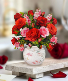 Effortlessly charming, the Mini Blooming Rose Bouquet is a burst of garden roses and snapdragons, shimmering in soft shades of pink and red—a little pop of color that’s big on beauty. This mini rose pop-up card and bouquet is a perfect mini romantic card for anniversaries, birthdays, or just because. Nestled in an ornate watercolor crackle vase, it’s a small floral pop-up that makes a big impression. Includes a vibrant envelope and matching blank notecard, making it easy to mail with just a few forever stamps. A timeless gesture, this card is sure to brighten anyone’s day.