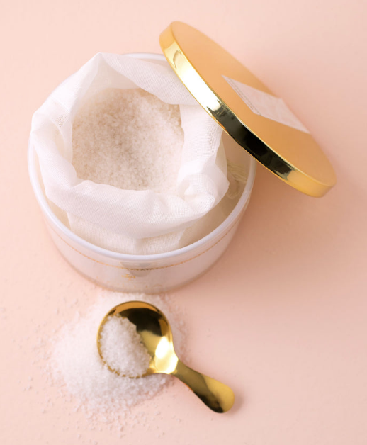 Gold accents and a reflective lid add brilliant shine to this gorgeous glass jar and tub-side keepsake. Inside, a delicate linen drawstring bag holds the luxurious sea salt soak. Dig in with an elegant gold spoon and drift off into a state of bliss. Makes a lovely gift for yourself and others.