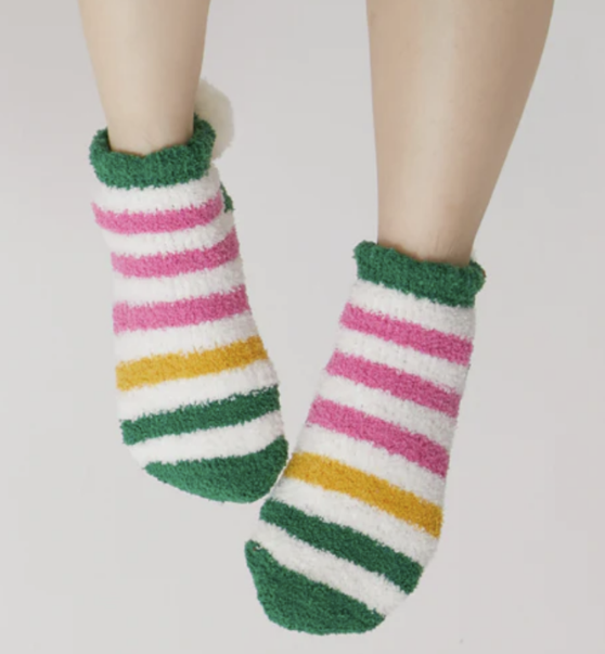Fuzzy comfort meets polished style in Shiraleah’s Gloria Home Socks. These socks feature a fuzzy texture, pompom heel detail, and have a unique feminine flair with its fun multi color stripe print. These socks have a rubber grip bottom and are packaged ribbon wrapped making them the perfect gift option.