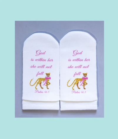 Cheetah design with Standing on the Word verse on the sole Psalm 46:5 God is within her, she will not fall.