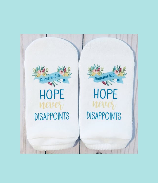 Banner design with Standing on the Word verse on the sole Romans 5:5 Hope never Disappoints