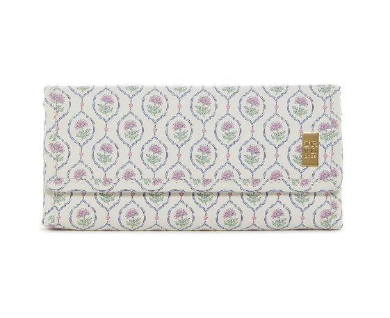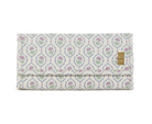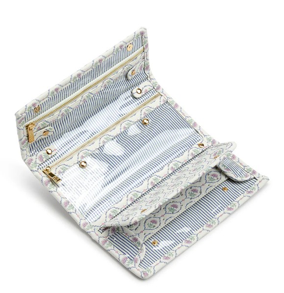 Attention globetrotters, take our Jewelry Wallet wherever you go while keeping your jewelry in place whether - business, leisure, and everything in between. Our sleek, high functioning wallet has 2 inside zip pockets, snap tabs for chains, a pendant pouch, ring roll and earring bar with a protective flap. Lined in our New chic pink pinstripe cotton!