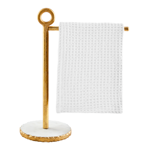 The Gold Tea Towel Stand is a chic and practical addition to your kitchen or bathroom. Crafted from lacquered wood, this stand boasts a footed marble base that adds a touch of elegance to its design. Not only does the marble base provide stability, but it also adds a luxurious element to the overall aesthetic. This stand is ideal for hanging and organizing tea towels, ensuring they are always within arm's reach. With its gold finish, it exudes sophistication, making it a stunning and functional accessory for any household.