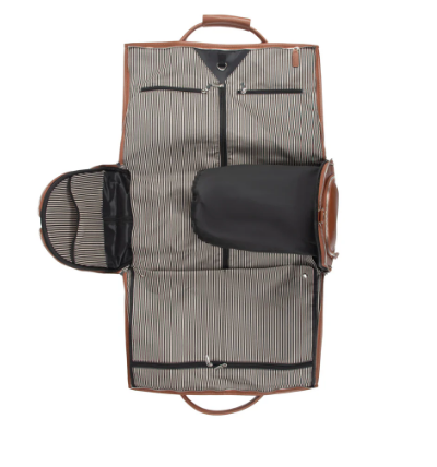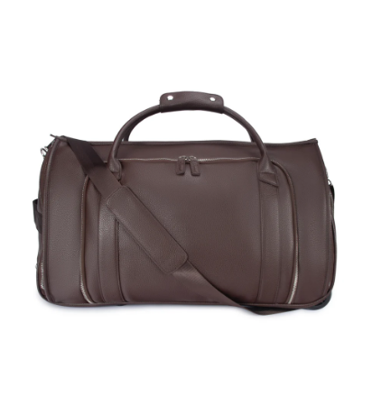 This sleek, stylish bag blends functionality and fashion for the modern traveler. Made from high-quality vegan leather, it functions as both a garment and duffel bag, perfect for any trip. Its carry-on size ensures hassle-free travel. The 2-stage telescoping handle and wheels make it easy to maneuver, and the trolley sleeve slides onto any luggage handle. The exterior office zipper pocket securely holds up to a 14" laptop. With 3 open welt pockets and 1 zipper pocket, organizing essentials is easy. The exterior zipper pocket can hold 1 to 2 pairs, ideal for business trips or weekend getaways. Inside, 4 zipper pockets, a metal ring for hanging garments, and 1 open side pocket keep everything in place.