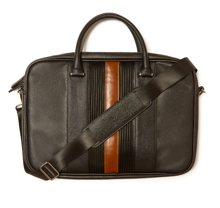 The Garrett Laptop Case is a classic work essential; crafted with the finest vegan leather and lined with our signature striped lining, the details of this bag are sure to turn heads. Smart external trolley pass on the back for easy transport and additional storage. Features a adjustable shoulder strap; interior zipper and open pockets for quick access. Interior padded protection for your computer, fits up to a 15" laptop.