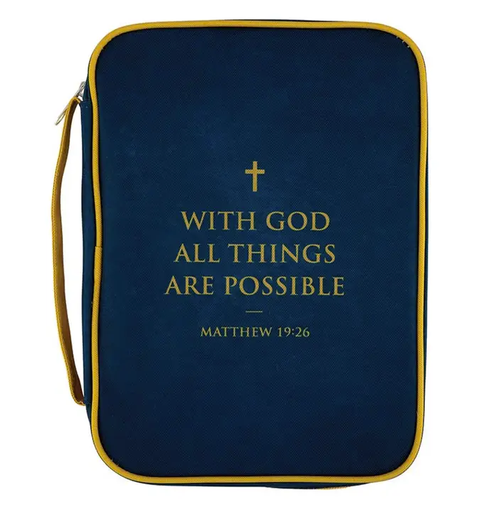 Protect your Bible with the "All Things Are Possible" Bible cover, featuring a bold navy and gold design. Inspired by Matthew 19:26, this cover serves as a daily reminder that with God, all things are possible. Durable and stylish, it’s perfect for keeping your Bible secure while reflecting your faith.