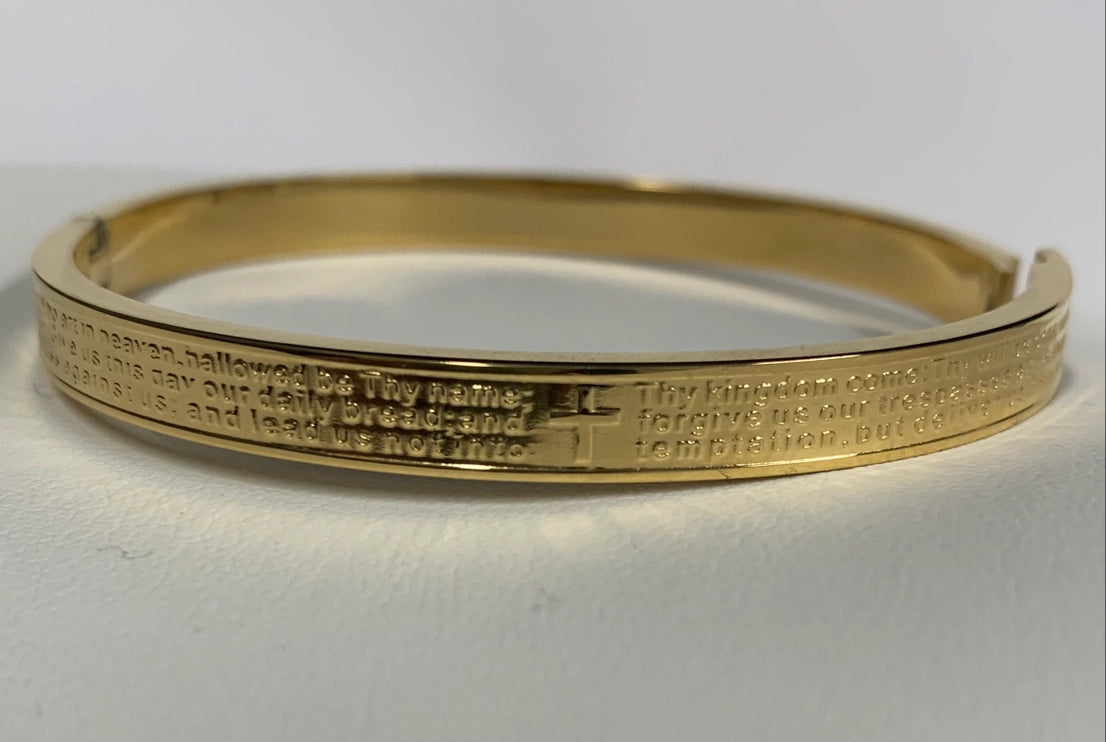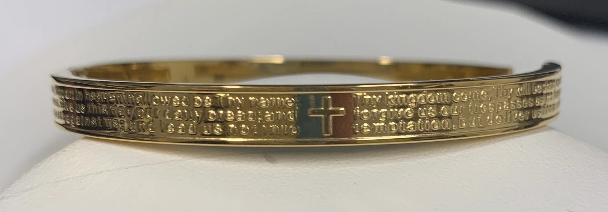 This waterproof adult-sized bangle features the Lord's Prayer, "Our Father," engraved on a hinged bracelet. Proudly made in the USA and weighing just 0.6 oz (17.01 g), it’s a stylish reminder you can wear everywhere. Ready to ship anywhere in the US