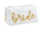 This dazzling white polyester zipper bag is a perfect blend of style and functionality, designed to add a touch of glamour to your everyday essentials. The exterior is adorned with an intricate tinsel embroidery design saying "Bride" and  gold zipper, creating a shimmering effect that catches the light beautifully.