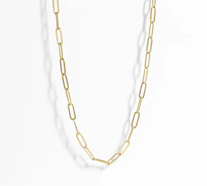 Looking for a minimal yet eye-catching necklace to compliment your customer's everyday style? The 18K Gold PVD stainless steel paperclip chain necklace is a modern, yet minimalist necklace for women that features a new trending chain design using dainty, paper-clip styled links.