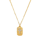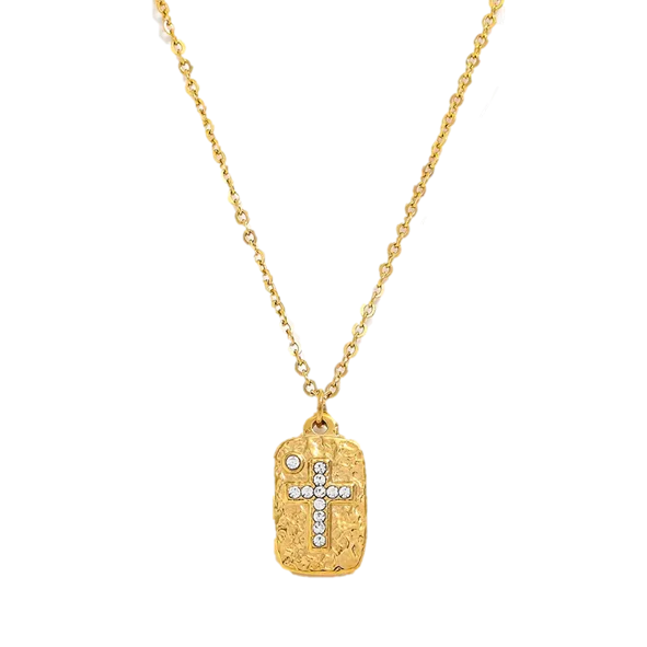 Elevate your style with our Hammered Cross Necklace. This stunning shield necklace is crafted with high-quality stainless steel and plated in gold. The hammered cross design is adorned with sparkling simulated diamonds. Make a statement with this versatile and luxurious accessory. 16" plus 2"