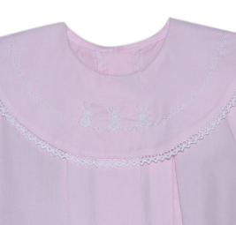 Hop into spring with this adorable Bailey Girl Pink Bubble! Featuring precious embroidered bunnies dancing along the bib collar and finished with delicate white trim, this sweetest little bubble is perfect for Easter celebrations. The convenient snap bottom closure makes diaper changes a breeze. Subtle enough to wear all season long, it's the ideal piece for your little one's spring wardrobe.