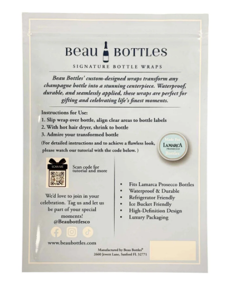 Beau Bottles' custom designed wraps transform any champagne bottle into a stunning centerpiece! Waterproof, durable, and seamlessly applied, these wraps are perfect for gifting and celebrating life's finest moments! Engagements! Birthdays! Weddings! Showers! And More!