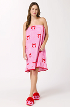 Wrap yourself in sweetness with our Bow Bath Wrap. Made from plush, cozy fabric, this pink wrap features an all-over red bow print and a playful ruffled hem. It secures easily with an elastic top and adjustable velcro closure, making it perfect for post-shower lounging or getting ready in style. With its flirty, feminine flair, this wrap is just as cute as it is comfy.