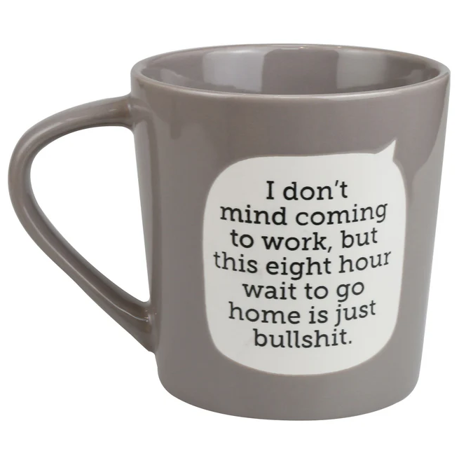 - Mug reads: I don't mind coming to work, but this eight hour wait to go home is just bullshit.