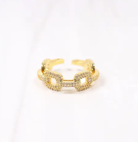 This ring has a chain link design and is covered in sparkly CZs. It is slightly adjustable to fit most ring sizes.