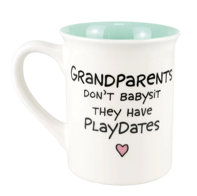 Share the big news with this playful mug by Our Name is Mud. In bright colors this 16 oz stoneware cup shares a message of congratulations to the new grandparents and jokingly grants them the title of babysitters! Celebrate the next chapter together.