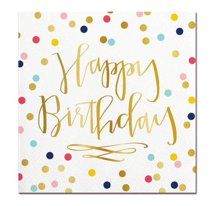 - Polka dot pattern with the phrase "Happy Birthday" in gold lettering