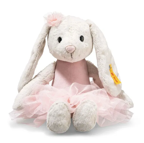 Twirl into joy with Hoppie Ballerina Rabbit in her adorable pink tutu! Dressed in a soft boa bodysuit, a tulle headpiece, and a flowing tutu, Hoppie is ready to dazzle on stage. Her extra-long ears sway gracefully during pirouettes, while her doll-like dangling body and granulate-filled paws ensure perfect posing for all her ballet moves. Measuring 12 inches tall, Hoppie is the ultimate companion for little and big dancers, bringing charm and elegance to every playtime performance.