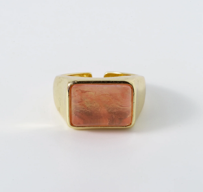 Peach colored gemstone in a gold filled setting featuring an open design. Wear a statement piece like this one to show who is boss! Designed with a thick flat top setting with the stone embedded into it . Wear alone or stacked to add your own personal touch!