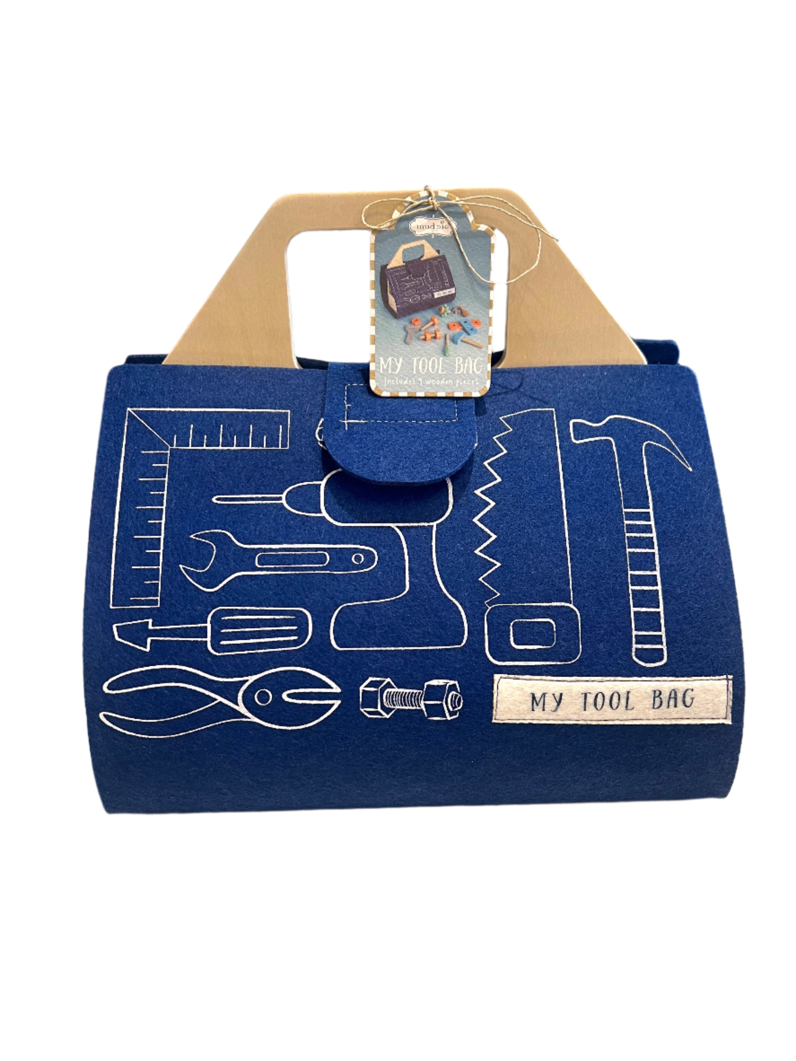 Our Felt Tool Bag Play Set has all the essentials to play Mr. or Miss Fix It! Includes 9 wooden pieces in a felt bag that reads "My Tool Bag". The bag holds so many fun tools like wooden bolts, a screw, a level, a hammer, a screwdriver, a wrench and a ruler. This tool set is intended for ages 3 and up.