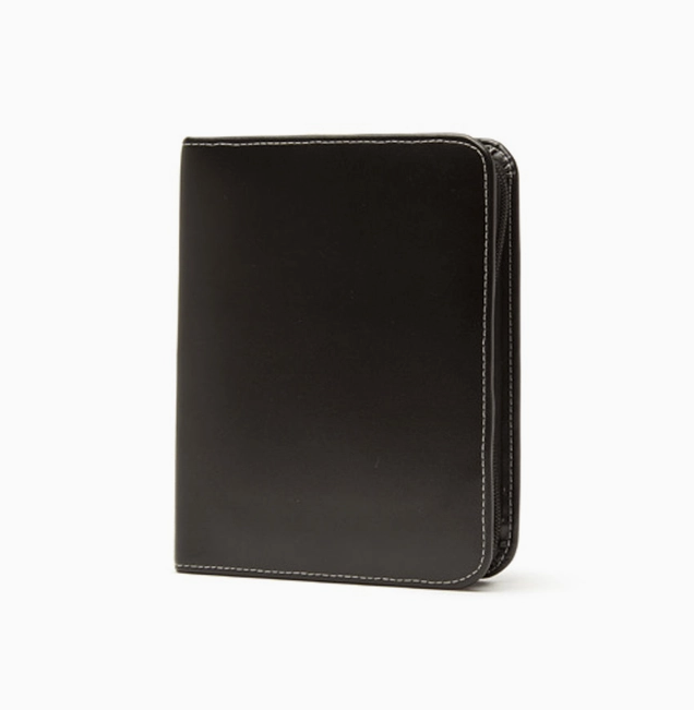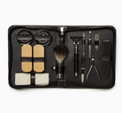 Vegan leather zipper case with Mach 3 razor compatible, badger brush, cleaning cloth, shoe polish(black), shoe polish(neutral), shoe brush, shoe hard brush, comb, cuticle nippers, tweezers, cuticle pusher, nail file and nail clippers.