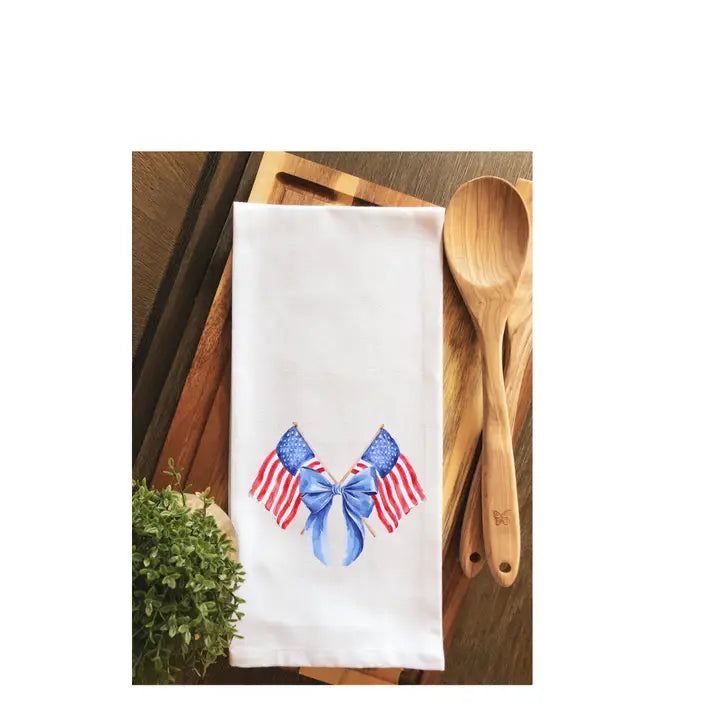Elevate your kitchen decor with our Patriotic Flag Tea Towel for all of the Red, White & Blue holidays! 100$ cotton, double pressed.