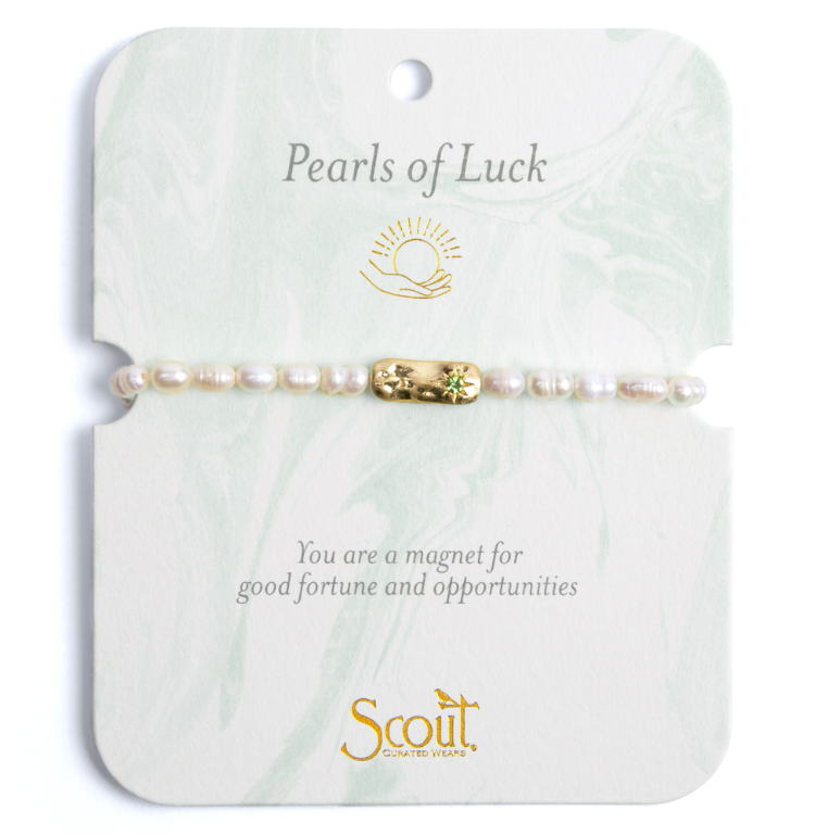 Engravings and inset crystals represent an affirmation to channel Love, Luck, Protection, or Courage. Materials: Freshwater rice & baroque pearls, Faceted crystal, 14K Gold or Sterling Silver Dipped Brass, Stretch cord.