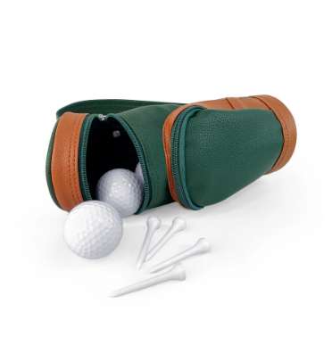 Enhance your golfing experience with the Arnold Golf Bag, ideal for both casual outings and competitive play. Made from premium vegan leather, it mimics a miniature golf bag, blending luxurious aesthetics with sustainable style. Inside, it holds four high-performance golf balls and four white tees to refine your swing. Designed for convenience, the bag features a durable clip and strap for effortless transport from tee to green or the clubhouse. It’s the perfect gift for any golf enthusiast!