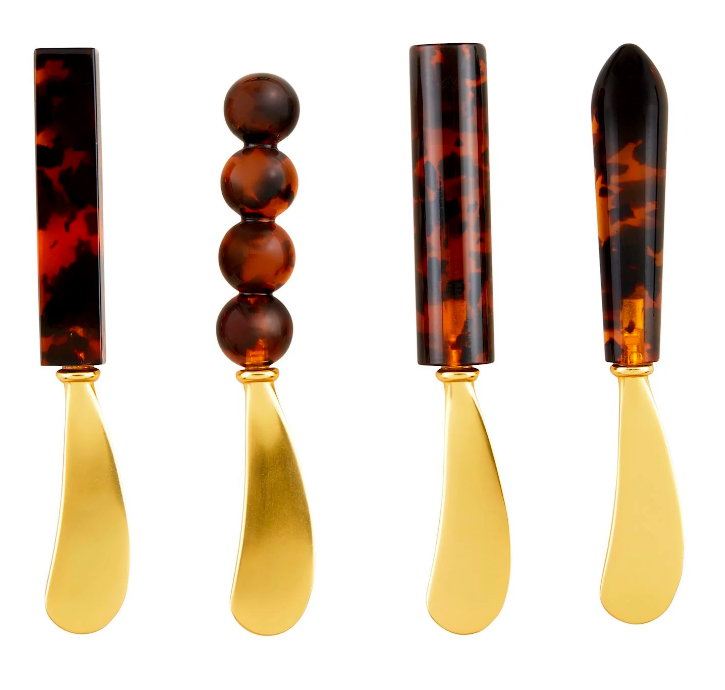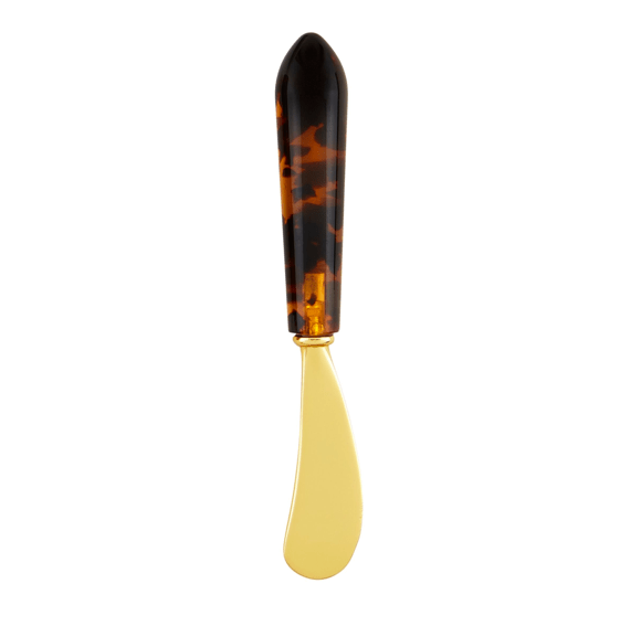 Tortoise Acrylic Spreader: This elegant spreader features a brass-finished stainless steel blade, ensuring durability and a touch of sophistication. The handle is crafted from tortoise acrylic, offering a unique and stylish appearance that complements any table setting. Measuring 5 1/2 inches, it is the perfect size for spreading your favorite cheeses, butter, or spreads with ease and precision. Ideal for entertaining guests or enhancing your everyday dining experience, this spreader combines functionality with a chic design.