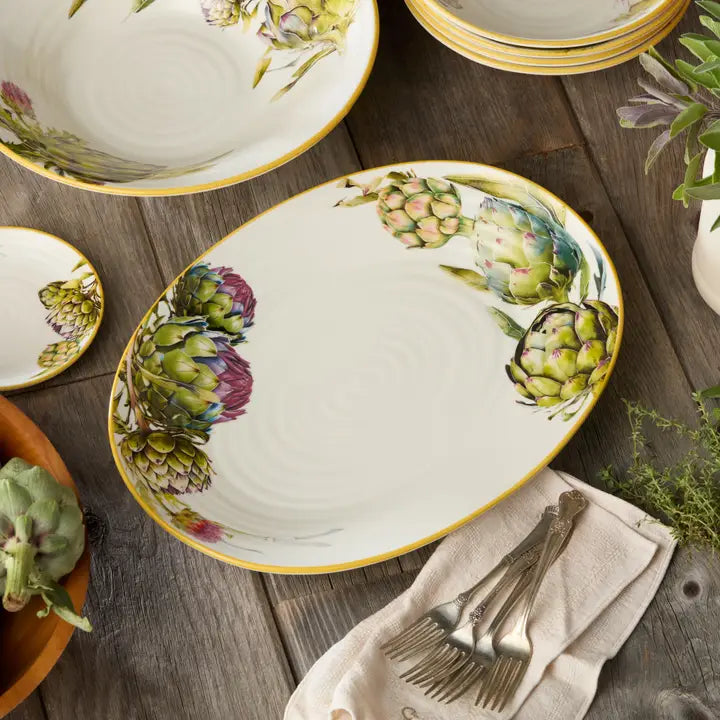 Serve up garden-fresh vibes with the Verdura Oval Platter! This stunning 16 x 11.5 inch stoneware piece features a gorgeous printed design of artichokes and herbs that brings authentic Italian farmhouse charm straight to your table. Whether you're arranging roasted vegetables, charcuterie, or your latest culinary creation, this generously sized platter gives your food the spotlight it deserves. Durable enough for everyday dining yet elegant enough to impress at dinner parties, it's the perfect way to celebrate fresh ingredients and good company. Let every meal feel like a celebration of flavor and style. 16in x 11.5in