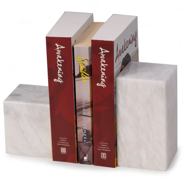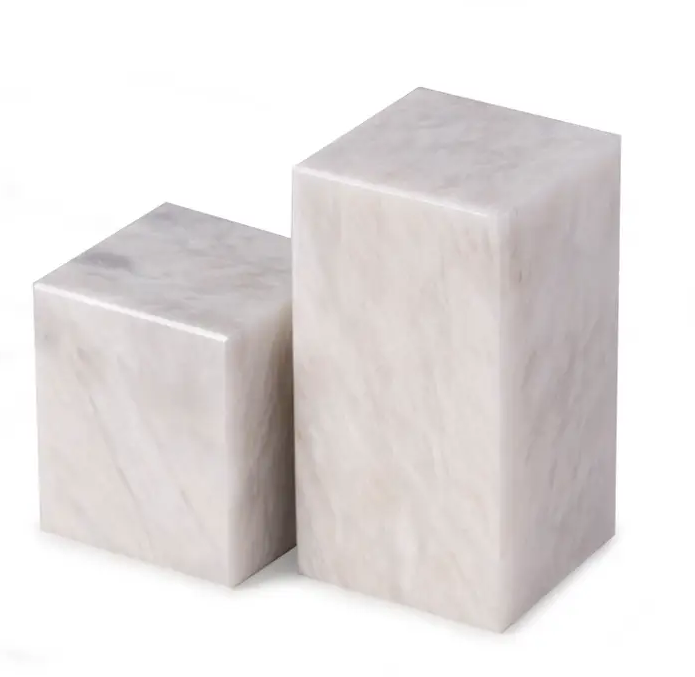 White marble cube design bookends. White marble. Asymmetrical cube design . Secure hold. Polished finish. Dimension: 3.5" x 3.5" x 6.5"