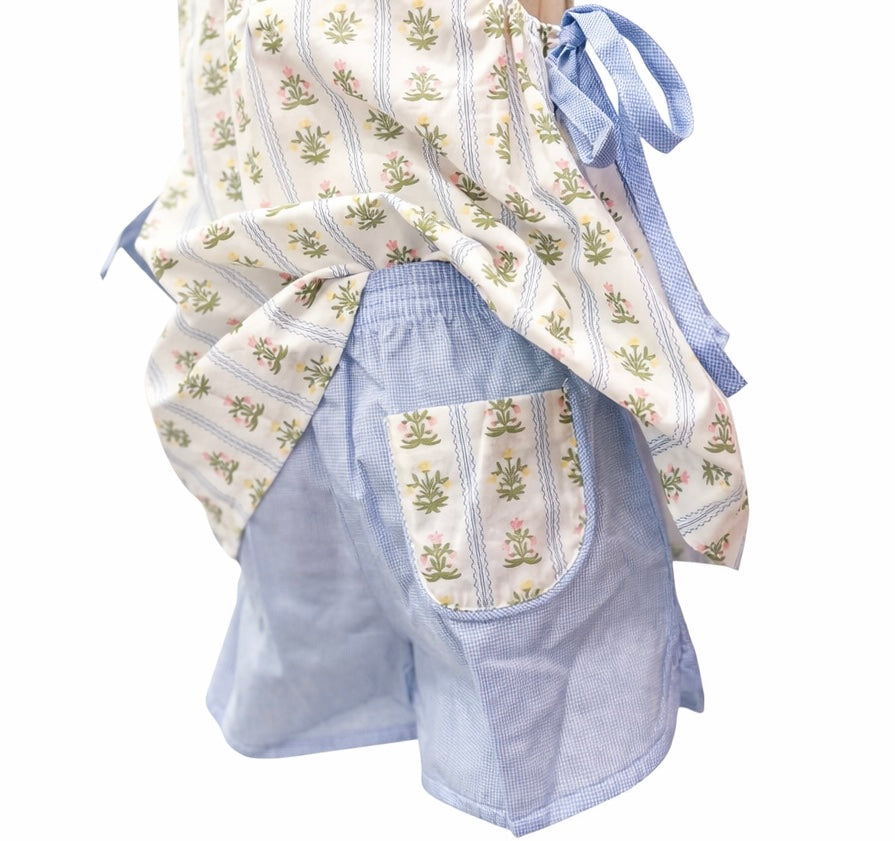 Keep your little one stylish in this charming Wildflower Whispers Ingram Short Set! Adorned with a delicate flower print and cheerful blue gingham accents, this set features sweet blue gingham collar, side ties and shorts that add an extra dash of personality. The perfect companion for sunny days at the beach, park, or backyard adventures. Built for comfort and playtime, it's an instant favorite for spring and summer wardrobes. Watch her bloom in this adorable design!